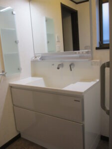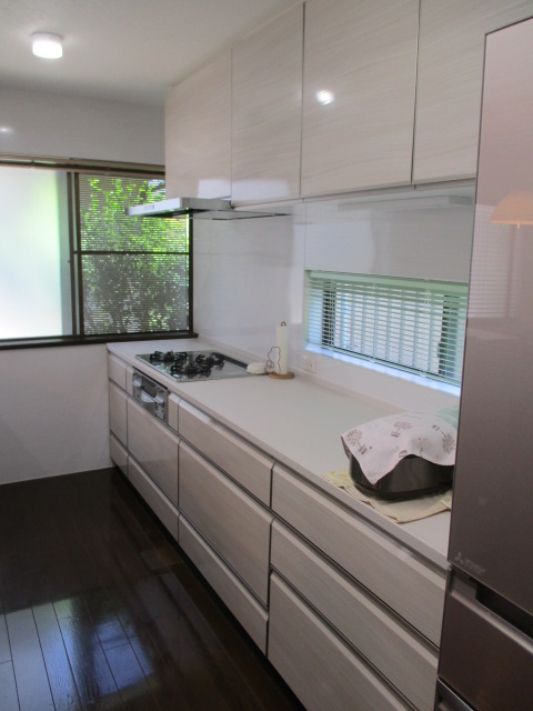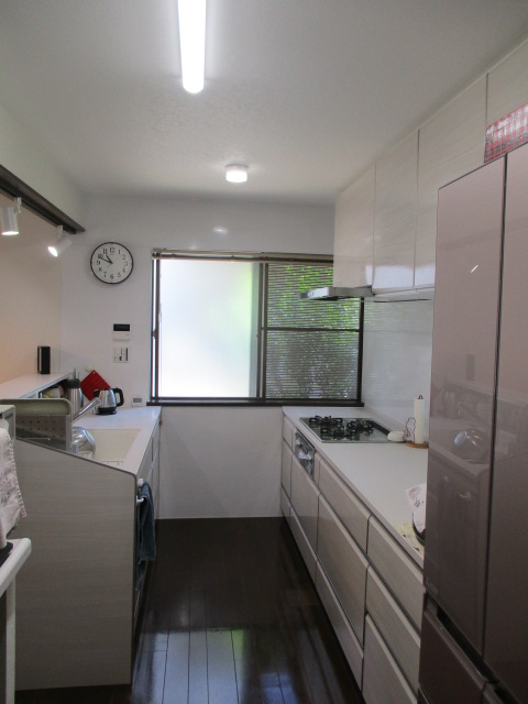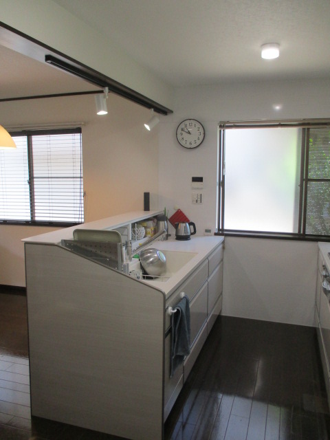 今回はキッチン上部(シンク)に吊戸棚を設置せずに、照明を可動式のスポットライトにしましましたので、明るさはもちろん、冷暖房も今までより効きがよくなり、夏の暑さも少し解消されたそうです。
