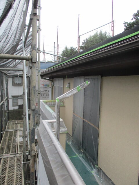 作業の際は足場をたて、安全に配慮し効率よく仕上げていきます。屋根に見られた亀裂などの補修も行いました。