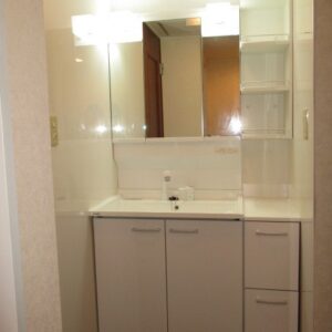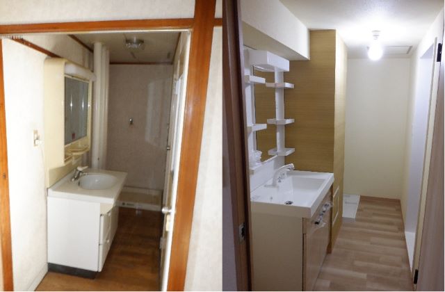 間仕切りを無くし開放的な空間を実現しました。元の間取りでは洗面台の前が狭く、トイレの扉を全開にすることも困難でしたが、間取りの変更により十分なスペースが設けられました。間取りの変更の中で活用できる箇所は収納や配管スペースとして活用しています。