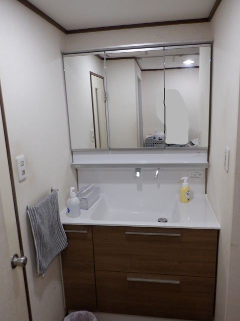 洗面化粧台の交換もご依頼いただき、お使いだった75cm幅の洗面化粧台を1mへ大きくし、壁の間にぴったりと納まっています。収納力の向上と見栄えや使い勝手を考えキッチンとは逆のことをしています。